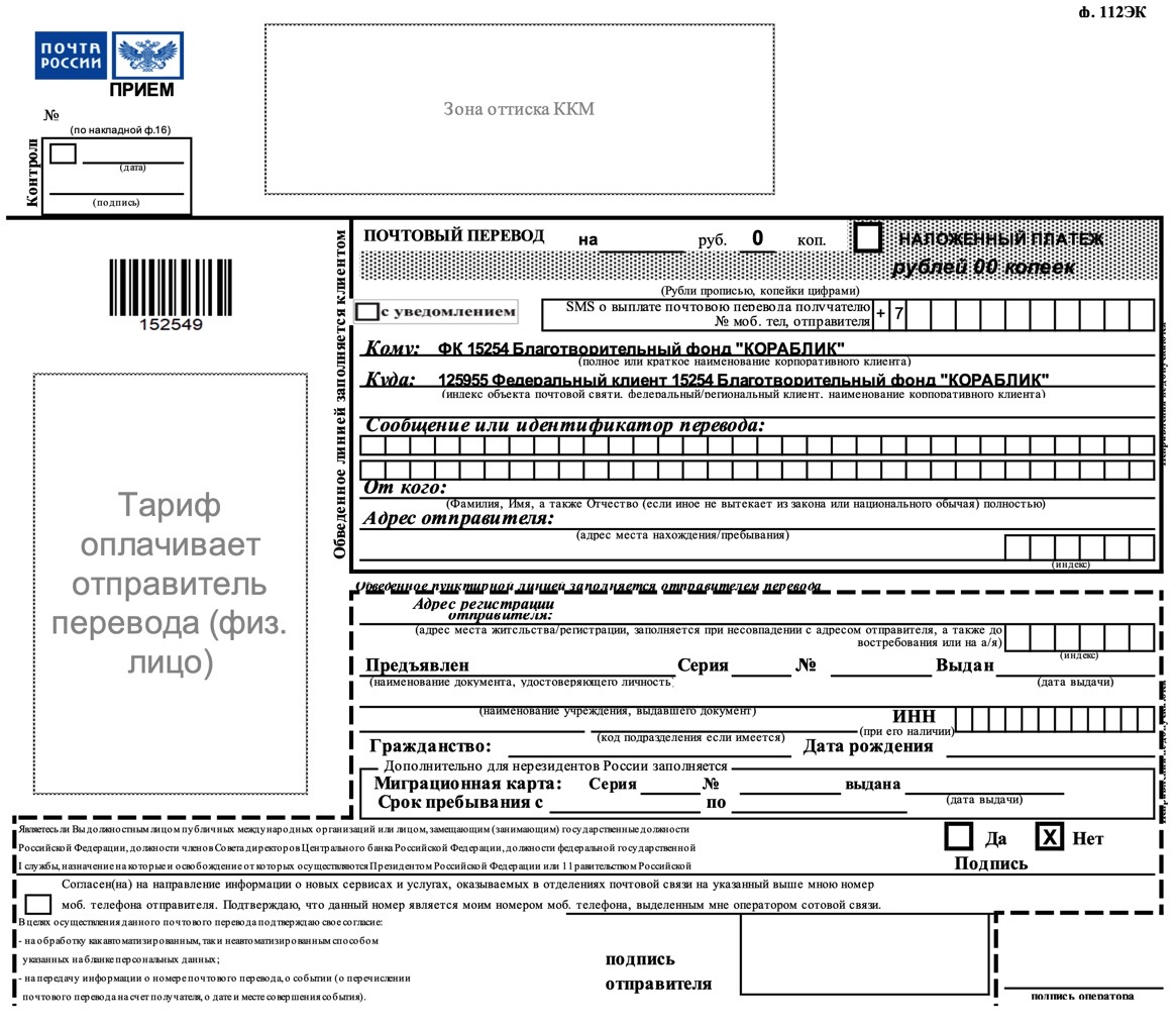 - У оператора почтовой связи в отделении попросить бланк ф.112, внести в него федеральный номер, который Почта России присвоила фонду - 15254, а затем сумму и свои реквизиты, после чего заполненный бланк передать обратно оператору и сделать пожертвование